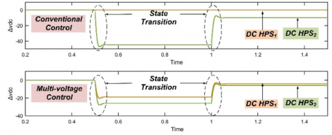 The multi-voltage controller causes reduction in voltage on HPS1 by 12.58V and 8.39V in state-II and state-III respectively while HPS2 voltage deviated by 17.52V and 11.61V in state-II and state-III respectively. In multi-voltage controller the voltage deviation in both the HPS are shared and under the allowable limit which results in good dynamic performance of the system. Figure 13 represents deviation in voltage for both HPS under conventional and multi-voltage control.