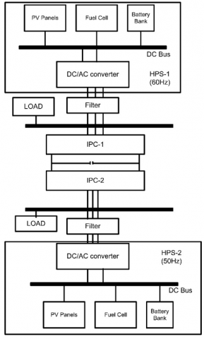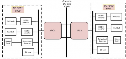 The It is a challenging situation for flexible intertied HPS in stand-alone operation where the total load is to be shared and managed autonomously. The proposed scheme involves fast and flexible power control which minimizes the system dynamics. The adaptive control proposed includes coordinated control to share appropriate power among different HPS according to their ratings. The proposed control technique is designed with adaptive correction factors δv obtained from Eq. (2) for intertied HPS. Since power fluctuations result in change in the output of system; coordinated control among individual HPS ensures power sharing among different HPS. The objective of proposed controller is to share appropriate active power in intertied HPS with coordinated voltage deviation under varying load conditions. The proposed control technique is designed with adaptive correction factors δv. This method is proposed to connect q no. of DC HPS with common bus. For simplicity in this case two DC HPS of voltages 500V and 800V through a common DC bus of 1000V is considered as shown in Figure 5, where interlinking power converter (IPC) is responsible for bidirectional power flow between two HPS of different voltages.