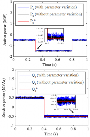 Unbalanced network voltage is considered in all simulation cases, According to Figure 4, a 15% grid voltage drop in phase A between 0.5 and 0.7 s is considered. The performances of the both power control methods SOSMC and ASOSMC are simulated and compared.