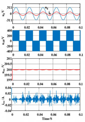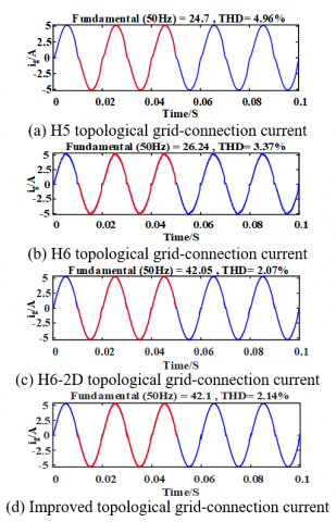 In order to verify the performance of the improved topology, the simulation models of H5 topology, H6 topology, H6-2D topology and the improved topology were built on MATLAB/Simulink platform, and the same control strategy was adopted for the four topologies. Firstly, the effective values of common mode leakage current of the four topologies were compared and analyzed through simulation, which were respectively about 35.36 mA, 12.73 mA, 14.14 mA and 4.24 mA, as shown in Figure 9. At the same time, the ig total harmonic distortion (THD) of the grid-connected current of the improved topology is 2.14%, which is better than that of H5 topology and H6 topology, and close to that of H6-2D topology, and has excellent grid-connected output characteristics as shown in Figure 10. From the comparative analysis of the four topologies, we can see that the improved topology can reduce the common mode leakage current more effectively than the other three topologies, and the output voltage uAB of the four topologies is three levels under unipolar modulation, which has good DC characteristics. The parasitic capacitance of the PV panel is 300 nF, and the other simulation parameters [3, 21] are shown in Table 3.