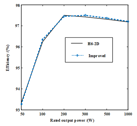 In the absence of line loss analysis and the same output power, the conversion efficiency of the improved topology and H6-2D topology is compared, as shown in Figure 11. Although the modified topology adds a power switch, the common-mode leakage caused by common-mode voltage suspension is more effectively reduced by voltage clamping at the midpoint of the busbar capacitor. Therefore, the conversion efficiency of the improved topology proposed in this paper is similar to that of H6-2D topology.