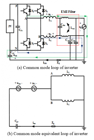 Isolation between the PV grid inverter and power grid due to no electrical isolation transformer, photovoltaic cells and parasitic capacitance between earth and therefore will form a parasitic capacitance between Cpv, filtering inductance L1, L2, and the earth of common mode resonant circuit, P and N is negative, the Cdc is DC bus capacitors, Cdm, Ccm and Lcm electromagnetic interference (EMI) filter. The high frequency action of the inverter switch will lead to changes in the common-mode voltage at both ends of the parasitic capacitor, which will form the common-mode leakage current icm in the circuit, and the parasitic capacitance value can reach 50-150 nF/kW. This is the generation mechanism of the common mode leakage current of the unisolated grid-connected PV inverter [18]. The common mode circuit of the transformerless PV inverter is shown in Figure 1(a). The parasitic capacitance to ground is ignored in the output of the inverter.