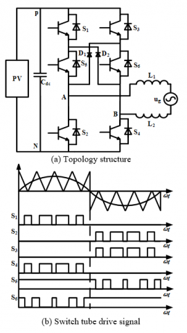 Figure 2(a) shows the traditional H6-2D topology without midpoint voltage clamp [20]. On the basis of the full bridge topology, two switches S5 and S6 are introduced into the middle of the left and right arms of the full bridge respectively, and at the same time, two fast recovery diodes D1 and D2 are connected to overcome the shortcomings of the H6-2D topology based on MOSFET switches [17]. (S1-S6 is IGBT switch tube). The switch tube drive signal for this topology is shown in Figure 2(b). In the positive half period, S1 and S4 switch at high frequency, while S5 is always in the on-state. When S1, S4, S5 on, the rest of the switch tube and diode off, for power transmission mode; When only S5 and diode D2 are on, it is in continuation mode. The S5 and S6 switches and the quick-recovery diodes provide a path to the zero-voltage continued current mode throughout the cycle.