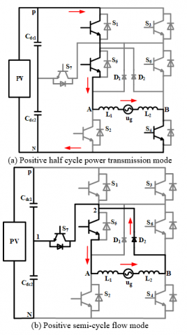 The common-mode and different-mode voltages of the improved topology are shown in Table 2. In one cycle of grid voltage, switch S5 is always in the conduction state within positive half cycle, and switch S6 is always in the conduction state within negative half cycle. The circuit has four operating modes.
