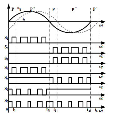 The improved topology is shown in Figure 3(a). An insulated-gate bipolar transistor (IGBT) is introduced, and the DC bus capacitance Cdc is divided into two series capacitors, Cdc1 and Cdc2, respectively. The nodes with two capacitors in series provide a midpoint voltage potential of the bus. D1 and D2 are quick recovery diodes. L1 and L2 are symmetrical grid-connected filter inductors. Figure 3(b) shows the switch drive signal of the improved topology. The improved topology can not only achieve AC-DC decoupling, but also effectively clamp the common-mode voltage ucm to the midpoint voltage of the bus during the continuation mode. but also effectively clamp the common-mode voltage ucm to the midpoint voltage of the bus during the continuation mode.