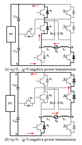 When the improved topology operates in the reactive operating mode, there are altogether six operating modes within a grid voltage cycle. Except for the four operating modes as shown in Figure 4, the other two operating modes work in the period of negative power transmission. At this time, the product of the instantaneous value of grid voltage and the instantaneous value of grid-connected current is negative. As shown in Figure 5, (t1-t2) and (t3-t4) are positive power transmission stages, and their working modes are Figure 4(a) mode 1 and Figure 4(c) mode 3, respectively. The working modes of (0-t1) and (t2-t3) are shown in Figure 6(a) and Figure 6(b), respectively.