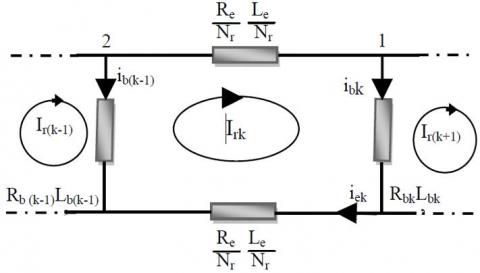 Figure 3 represents the equivalent electric circuit of a mesh of the rotor cage, where the rotor bars and the portions of short-circuit rings are represented by their resistances and corresponding leakage inductances [12].