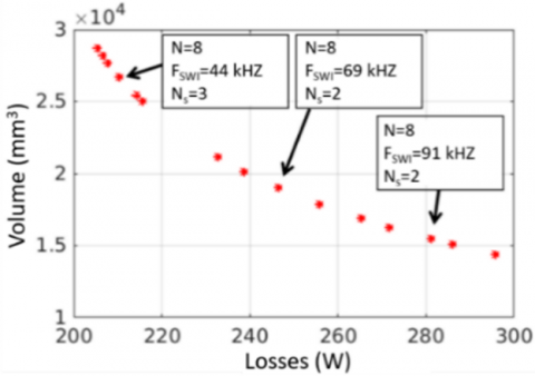 To assess the impact of each design parameter, we calculated the losses in the semiconductors and the magnetic coupler considering a large range of phase numbers and switching frequencies (Figure 9). The losses are calculated considering: