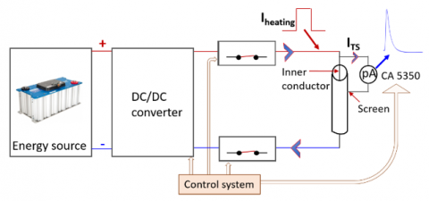 Figure 2 shows the TS currents for different power pulses applied to a 4 meters long cable corresponding to a total capacitance of 702 pF. The proportionality between the TS currents amplitude (Figure 2) and the power pulses is in accordance with the theory (Eq. 2) which validates the simulation model. It comes out from these simulations that a minimum 300 A heating current pulse during 100 ms induces a measurable TS current (>10 pA) taking into account current amplifier characteristics and noise level expected in laboratory conditions. Considering simulation results, the DC/DC converter will be developed to provide short current pulses (≃100 ms) of 600 A in the cable core for space charge measurements.