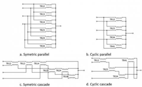 A single magnetic core [13, 14] (known as monolithic structures) (Figure 4) or several separate transformers [6, 12] (Figure 5) can be used to couple all phases. The main drawback of the monolithic structure is the complexity of building the magnetic core [15]. The use of separate intercell transformers (Figure 5) improves the coupler modularity and greatly improves its practical implementation. In fact, the magnetic coupler is made using standard commercial core shapes U, E and I. Cyclic parallel and cyclic cascade topologies are interesting (Figure 5b-d) since for a N phases converter they only require N transformers [15]. The cyclic cascade topology (Figure 5.d) is chosen for the implementation in the realized converter because of the low number of transformers required and its high filtering quality compared to cyclic parallel topology [15]. Another drawback of magnetic coupler is necessity of current closed loop control in order to obtain an equal repartition of the output current in phases. Indeed, from a practical point of view, the disparities between the active devices and between the passive devices cause an imbalance in the distribution of the output current between the phases which can lead to the saturation of the magnetic components.