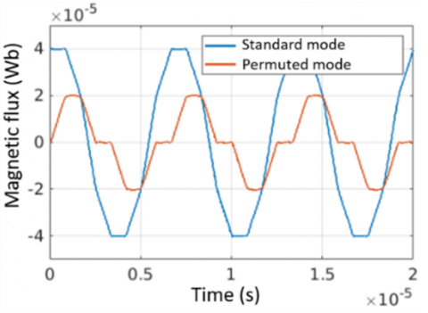Figure 7 presents voltage across windings using standard and permuted mode for 50% duty cycle. The reorganization of phases control in this example (8 phases) implies the reduction of phase voltage from 48 V peak (input voltage) to 24 V peak. Consequently, magnetic flux is reduced by a factor of 2 (Figure 8). So, the permuted mode is an efficient method to optimise magnetic coupler volume without changing design parameters such as input voltage or switching frequency.