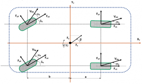 $\begin{aligned} I_z {\theta}= & {\left[\left(F_{x 1}-F_{x 2}\right)+\left(R_{r 3}-R_{r 4}\right) \cos \delta_R\right.} \left.-\left(F_{y 3}+F_{y 4}\right) \sin\delta_R\right] d-\left(F_{y 1}+F_{y 2}\right) a-b\left(F_{y 3}+F_{y 4}\right) \cos \delta_R-b\left(R_{r 3}+R_{r 4}\right) \sin \delta_R\end{aligned}$ (18)