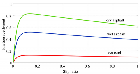 The condition of the road and the amount of produced motor torque both impact the slip value. Eq. (24), which describes the traction or friction coefficient, is shown in Figure 4. In the equation, the force that each wheel and tire may transmit horizontally on the roads is denoted by the symbol Fd (24) [5].