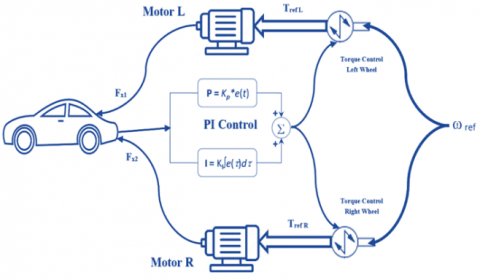 The acceleration pedal angle influences the command torque TRef. Feedback from the relative speed differential between the two front wheels is used to manage each front wheel's speed ( $\mathrm{V}_{w \mathrm{R}}, \mathrm{V}_{w \mathrm{~L}}$) [15]. To achieve zero static error between the measured difference value $\Delta \omega=R / 2 d\left(V_{w R}-V_{w L}\right)$ and the reference value for the relative speed difference ($\Delta \omega_{\text {ref }}$), a PI controller is designed. When a discrepancy is found, the controller should adjust the torque reference to each motor using the torque trot (Tref R and Tref L).