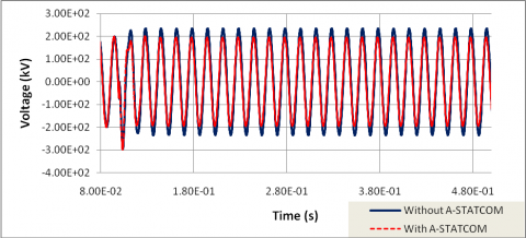 Figure 3 illustrates the significant effect of the introduced Advanced STATCOM on the mitigation of voltage swell over the conventional STATCOM device. In this case, both devices were used to mitigate a voltage swell with a magnitude of 351.54 (kV) which is 1.8 (p.u.). The proposed Advanced STATCOM compensates the voltage to approximately 196.14 (kV) [1.00 (p.u.)] after 4 cycles (0.07 sec), while the non-efficient traditional STATCOM compensates the voltage to approximately 284.359 (kV) [1.457 (p.u.)].