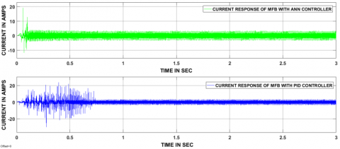 At 1.5 sec a heavy load is applied to the electric motor due to that huge current variations have been observed from above figure 10. MFB with ANN current response reached steady state within 0.8 sec, thereafter no current ripples presented. But MFB with PID current response does not reach the steady state within a stipulated time.