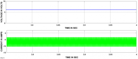 (3) During this mode of operation rated load is applied to the electric motor, which leads to drawing average power by an electric motor. So batteries can delivery total power required by the load. Due to rated load, motor maintains a speed between 4801 rpm to 4930 rpm. The output pulse signal of the designed MFB generates as 1 for math function U3 and generates as 0 for remaining math functions U1, U2, U4 according to the speed of an electric motor. The designed MFB combined with other controller generates a controlled pulse signal to the UDC which will work under boost mode.