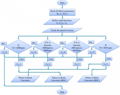During starting, the motor can stats with UC so controlled pulse signals are produced to BDC (boost), after some time period again controlled signals are produced to UDC as boost and BDC (buck). Due to a heavy load applied at 1.5 sec controlled switching signals are produced to BDC (boost) until response reaches the steady state. After reaching steady state, again controller signals are produced to BDC, working under buck mode and UDC (boost).