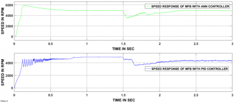 During this mode, a heavy load is applied to the electric motor. MFB with ANN as well as MFB with PID has taken 0.6 sec and 0.9 sec times at starting to reach the steady state. Thereafter at 1.5 sec, a heavy load is applied due to that both the controller's speed responses decreased drastically. MFB with ANN controller has taken 0.8 sec time to reach steady state, whereas MFB with PID doesn’t reach the steady state within a given time.
