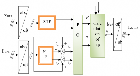 The identification method chosen effect the quality of the compensation of current harmonics. Many theories of instantaneous power exist in scientific literature the extension of the reactive power to non-sinusoidal waveforms is now a subject of controversy. Many new theories have been proposed. Akagi (Beaulieu & Ouhrouche, 2007). proposed a theory based on instantaneous values in three-phase power systems with or without neutral wire, and is valid for steady-state or transitory operations, as well as for generic voltage and current waveforms called as Instantaneous Power Theory or Active-Reactive (p-q) Theory which consists of an algebraic transformation (Clarke Transformation) of the three-phase voltages in the a-b-c coordinates to the α-β coordinates, followed by the calculation of the p-q theory instantaneous power components by eliminating the DC component of the instantaneous active power (corresponding to the fundamental component of load current) using a selective Filter STF, so the harmonic components can be identified. Figure 3 shows the modified scheme for the identification of reference currents during simultaneous compensation of harmonic currents and reactive power using the method of instantaneous power by using STF.