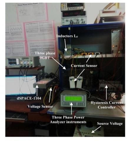 The complete active filter system is composed mainly of a three-phase source, a nonlinear load, a hysteresis current and a Non linear controller. We study the robustness of the non linear using experimental results for different operating modes. The test bench used for the experiment is presented in Fig. 5. The input step-down transformer (10.60KVA) is connected to the mains (380 V line to line) and delivers a lumped voltage of 220 V. The three-phase parallel active filter is achieved with a voltage source inverter. This VSI contains a three-phase IGBT 1200V, 50A (SKM 50 GB 123D). To ensure the dead time of control signals and the insulation, developed cards based on the IXDP630 component and specialized circuits (SKHI 22) are used.