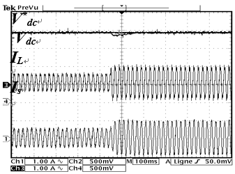 Figure 7. Experimental results with load changed: Dc voltage and reference, Load current, Source current