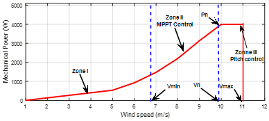 Figures 4 and 5 plots the characteristics of the employed wind turbine model for simulations. It shows a generic power curve for a variable speed, and variable pitch wind turbine. At low wind speed (zone 2), the objective in this zone is to extract the maximum power with the application of a command that captures available wind energy. This command called MPPT. In zone III where the wind speed is increased, the power increases considerably, so we must apply a command that limits this power with the keep electricity production. This command based on the orientation of the blades of the wind turbine, it is called pitch control.