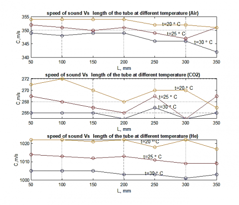 Measuring the frequency of created standing wave allows to calculate the speed of sound at different temperatures and for various types of gases filled the resonance tube. The experimental results that describe the variation of sound speed for the three gases (at different temperature points and when the length of the tube varies from 50 mm to 350 mm) is shown in Figure 4.