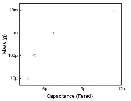 Figure 9. Capacitance-Mass (CM) profile with logarithmically increasing concentrations of powder 10 μg, 100 μg, 1 mg and 10 mg over capacitance
