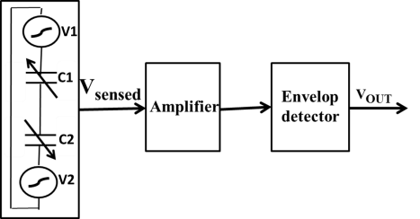 Building on the fact that the amplitude of the sensed signal is depending on the amount of the acceleration input, a signal conditioning and processing circuits was designed. The sensed signal was considered as an amplitude modulating signal. To obtain an output dc voltage, an amplifier and coherent detector was used. The equivalent electrical circuit of the sensor and the functional block diagram of the circuit is shown in Figure 5.