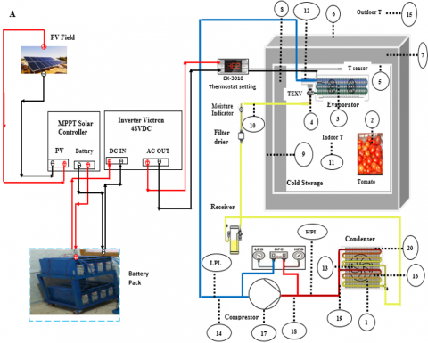 The drawing in Figure 3 illustrates the critical components of the pilot-scale test bench of the VCR system under experiment. The system consists mainly of a stand-alone solar PV conversion apparatus that supplies an AC output for a refrigeration unit's compressor and fan operation. The arrangement of the temperature, humidity, and pressure sensors is established by evaluating the thermo-mechanical chiller, which includes determining the compressor operation time, thermostat capabilities, and refrigeration effect on the inside of the chamber. Table 2 shows the different components of the cold storage refrigeration system. Our previous works provided advanced specifications for the solar PV refrigeration system [21-23].