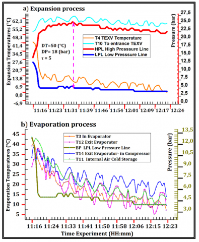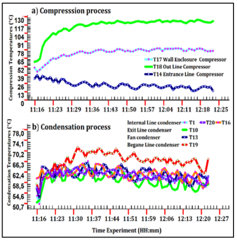 vapor compression refrigeration systems, measurement data, performance COP, condensing phenomenon, ambient temperature, pressure level, cold storage, solar PV, Saharan environment, remote areas