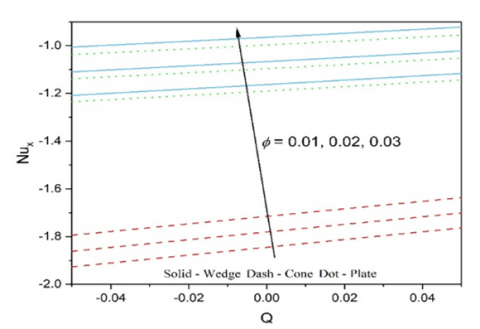 Figure 10 shows the variations in the values of $C f x$ for various values of $\lambda$ and $G r$ for all three flow cases. In general, the existence of a porous media increases skin friction. This is because the flow through the porous media involves viscous dissipation within the pores, resulting in greater shear stress at the solid surface, and skin friction doubles with a surge in the Grashof number due to a raise in the velocity distribution. Hence it is portrayed that skin-friction increases for $\lambda$ and $G r$. Additionally, compared to the other circumstances, skin friction is improved in the fluid flow case through cone. Effect of skin friction is studied in the design of aircrafts, ships, and other automobiles that move through fluids. Figure 11 illustrates how the increasing value of $\phi$ over $N u_x$ versus $Q$ for all three fluid flow cases.