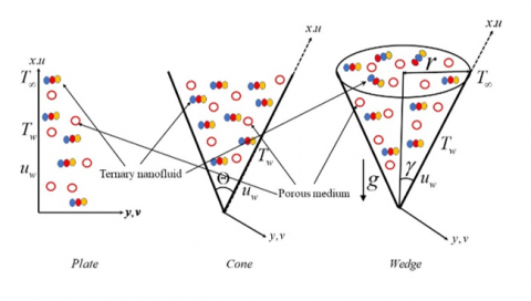 The present analysis considers three different geometries plate, cone, and wedge in which a two-dimensional, steady, incompressible ternary nanofluid is examined under the influence of MHD, porous media, and activation energy. Additionally, joule heating and viscous dissipation are considered. The current problem is considered in such a way that $x$ axis is parallel to body's surface and $y$ being normal. The physical model of the flow problem is shown in Figure 1. Let the half-angle of the cone/wedge, radius of the cone, and full angle of the wedge is symbolized as $(\gamma, r, \Theta)$ respectively. The temperature nearby surface i.e., $(y=0)$ and far-field temperature i.e., $(y \rightarrow \infty)$ is represented as $\left(T_w, T_{\infty}\right) .\left(C_w, C_{\infty}\right)$ represents the concentration near the surface i.e., $(y=0)$ and at far-field i.e., $(y \rightarrow \infty)$ representing boundary conditions.
