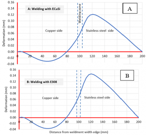 Figure 8. Deformation distribution and max. Deformation location digamma crosses the welding joint center line (A) welding with ECuSi and (B) welding with E308