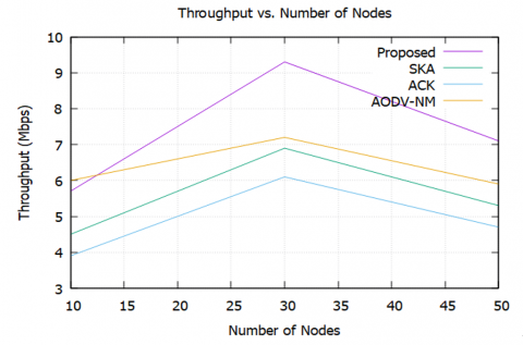 Figure 1. Throughput performance comparison of proposed routing with existing SKA, ACK, and AODV-NM with respect to varying number of nodes