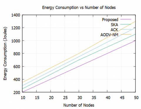 Figure 3. Energy Efficiency comparison of proposed routing with existing SKA, ACK, and AODV-NM with respect to varying number of nodes