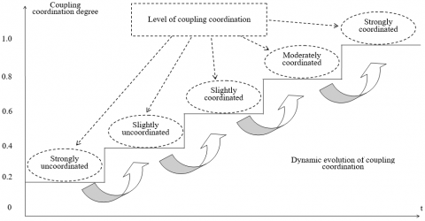 The coupling degree describes how much systems (subsystems) or elements interact with and influence each other. It is a mirror of the static coupling state between systems (subsystems) or elements. Coupling coordination degree reflects the degree of harmony and consistency between systems or elements during development, i.e. the dynamic changes and variation in coordinated state of a system in disorderly (low-level) and orderly (high-level) development.