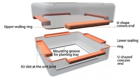 The modularization of functions is to design the basic compnents of the outer shell of the floating box to satisfy the floating load, and designing the core inside the floating box as an independent component with other functions. A floating box is formed by the outer shell embedded with the internal planting core (Figure 8), and the two parts are independent of each other. The outer shell of the floating box adopts the detachable design to reduce the packaging volume (Figure 9), as the components can be stacked during the transportation (Figure 10).