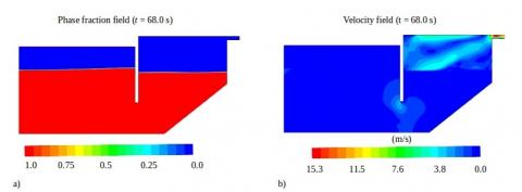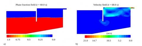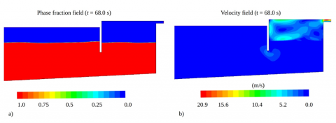 Beyond evaluated operational work parameters, it was also presented phase fraction and velocity fields. It was adopted the time instant of 68 s, the optimized OWC chamber geometry of (H1/L1)o = 0.4, and the submergence of frontal plate chamber of H3 = 2.5 m. In addition, three values for the seabed ramp geometry were considered: H2/L2 = 0.05 (Figure 12), H2/L2 = 0.2 (Figure 13), and (H2/L2)oo = 0.8 (Figure 14).