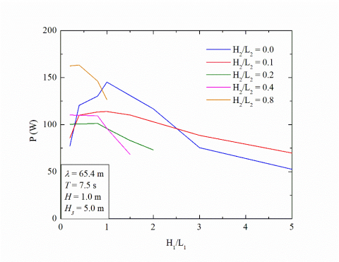 Still looking at Figure 11, in a general way, the increase of the H2/L2 ratio promotes an augmentation in OWC available power. Therefore, it is possible to define the twice optimized chamber geometry and the once optimized ramp geometry given, respectively, by (H1/L1)oo = 0.4 and (H2/L2)o = 0.8; reaching a twice maximized average power of Pmm= 331.57 W. If this value is compared with the maximum average power for the reference case (Pm = 240.88 W), an improvement of 37.7% was achieved.