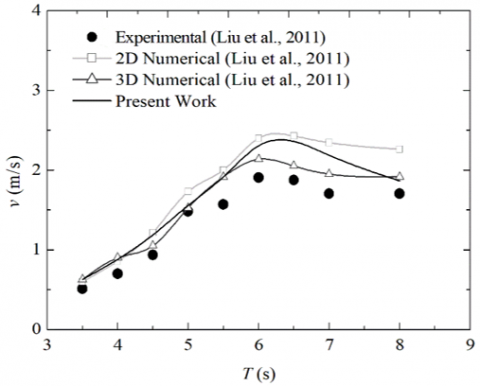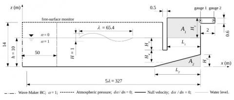 To validate the present numerical method for predicting of velocity and pressure fields into the OWC chamber, it was reproduced a case study investigated numerically and experimentally by Liu et al. [42]. It is worth mentioning that this comparison was previously performed in the work of Gomes et al. [35] with the same numerical code. Consequently, the same results obtained by Gomes et al. [35] are achieved here.