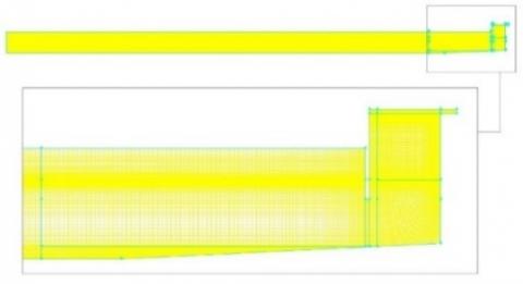 About the discretization of the computational domains, this study adopts finite rectangular volumes. Figure 3 shows the entire computational domain and also a detailed section around the OWC chamber. It is noticed that refinements are applied near the walls (surfaces with no-slip and impermeability boundary conditions), at the water-air interface, and at the outward of the turbine duct (where air mass flow rate is monitored). This study follows the bibliography recommendation concerning finite volume sizes for the current simulation type [8].