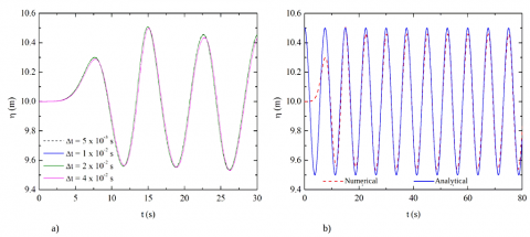 Figure 4a plots free-surface displacement of the analyzed cases with different time-step sizes, being possible to observe the good agreement among solutions except for the one that applies Δt = 4.0 ´ 10-2 s. In sequence, employing Δt = 2.0 ´ 10-2 s, the computational model verification was performed comparing in Figure 4b the free surface elevation of the water obtained with the present numerical code and the one reached with the analytical solution given by Eq. (8). One can note a good agreement between numerical and analytical results, with a minor relative difference of 5% after the numerical wave stabilization at t =15 s.