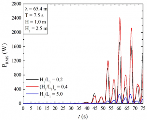 Figure 10. Comparison between transient results of the reference case and the case with H2/L2 = 0.8, considering H1/L1 = 0.2 and H3 = 2.5 m for RMS available power