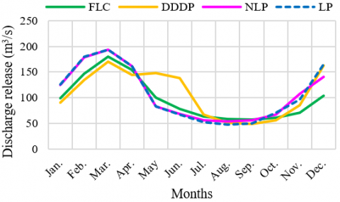 The results showed that the maximum average monthly discharge release from the reservoir during the operation period occurred in March with values of 180.42 $\mathrm{m}^{3} / \mathrm{s}$, 174.34 $\mathrm{m}^{3} / \mathrm{s}$, 193.29 $\mathrm{m}^{3} / \mathrm{s}$ and 193.29 $\mathrm{m}^{3} / \mathrm{s}$ while, the minimum average monthly discharge release occurred in August and September with values of 60.8 $\mathrm{m}^{3} / \mathrm{s}$ , 53.31 $\mathrm{m}^{3} / \mathrm{s}$, 53.76 $\mathrm{m}^{3} / \mathrm{s}$ and 48.06 $\mathrm{m}^{3} / \mathrm{s}$ according to FLC, DDDP, NLP and LP models, respectively. Also, it is worth to mention that the discharge releases with all methods for the whole considered period have satisfied all the downstream water requirements (irrigations, domestic, industrials, and environmental).