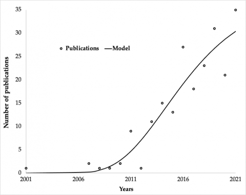 Different models have been used to represent the trends of the growth pattern of the publications, the main models are exponentials [22] with a rate of 0.2439 years-1 in the topic of adoption of water systems to climate change uncertainties, rate of 0.0728 years-1 (R2=0.87) in the topic of wastewater management [17]; other models are logistic with a rate of 0.1898 years-1 (R2=0.9132) in the topic of sugar beet to biofuels [23]. In this context, the quadratic model was used to estimate the rate of corporate social responsibility social [16].