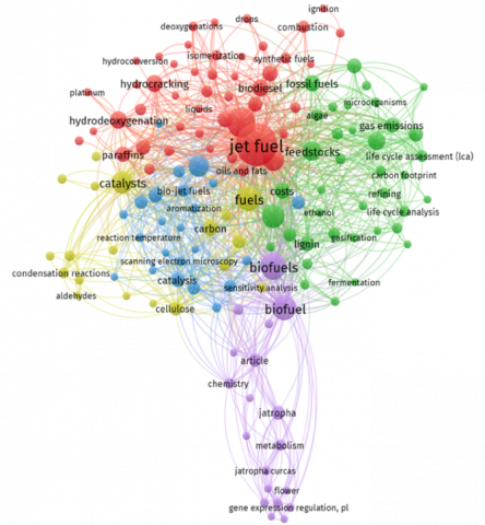 Figure 4 shows five clusters (red, green, blue, yellow and purple), where the most frequent keyword is jet fuel, followed by biofuels, fuels, biofuel, biomass, bio-jet fuel, catalyst, hydrocarbons, fighter aircraft, feedstocks, greenhouse gases and others. The keywords used in different documents are indicatives of the relevance of the topic of bio-jet fuel in the environmental, social and technical context. The keyword will be useful for other authors or students to define search criteria in a particular field in the future.