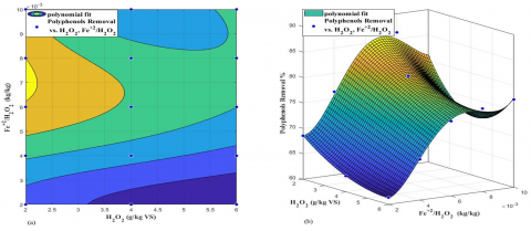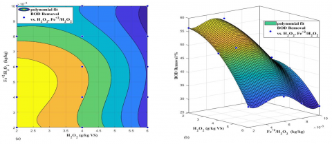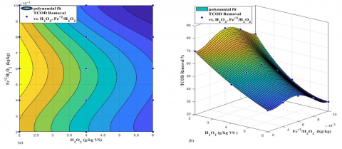 As a result, this technique has potential for full-scale use since it occurs at ambient conditions [18] and requires no specialized equipment [20]. Furthermore, H2O2 has no environmental or safety risks. As a result, numerous researches have been conducted on the applicability of this method to wastewater treatment [22-24]. This suggests that FP can improve the BOD5/COD ratio in the effluent, hinting that this chemical process can be followed by a biological system. If the pre-treated OMW meets the regulatory limitations for local sewage treatment, it can be transported to the municipal sewerage system for ultimate depuration.