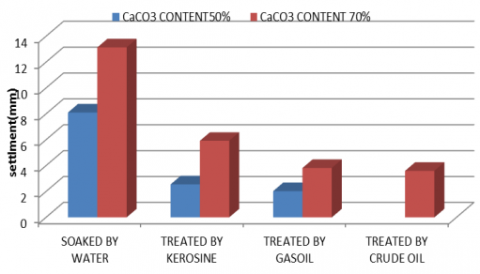 There is a limited number of studies dealing with the treatment of this type of soil one of these studies are by using chemical additives (Kerosene oil, Crude oil, Gas oil). The settlement was reduced for a foundation placed on calcareous soils with different content co calcareous soil 70% and 50% in a laboratory model. The improvement criterion was the reduction in the subsidence of the base by adding these additives. The results showed an improvement in the subsidence of the foundation after mixing the soil with these chemical additives, where the subsidence of the foundation was reduced to more than 60%, as shown in Figure 3 [9]. However, these chemical methods of treatment remain unsatisfactory due to the lack of durability of these petroleum materials over time as a result of the exposure of the soil to washing or evaporation with time. Therefore, there was a need to find physical methods of treatment that would be more permanent and less expensive.